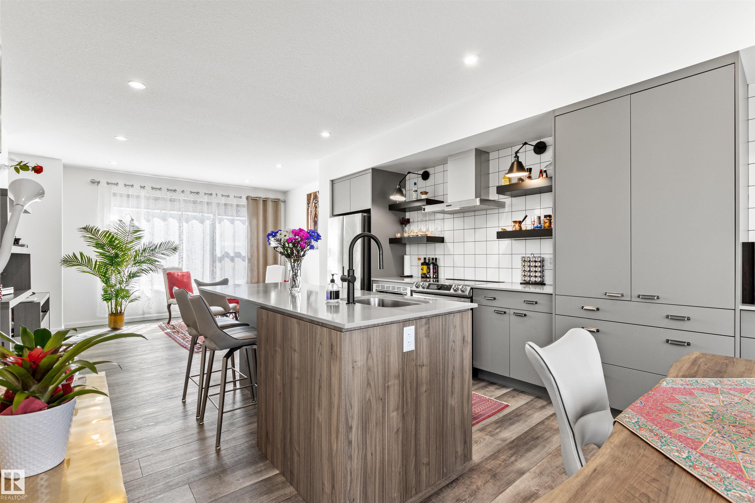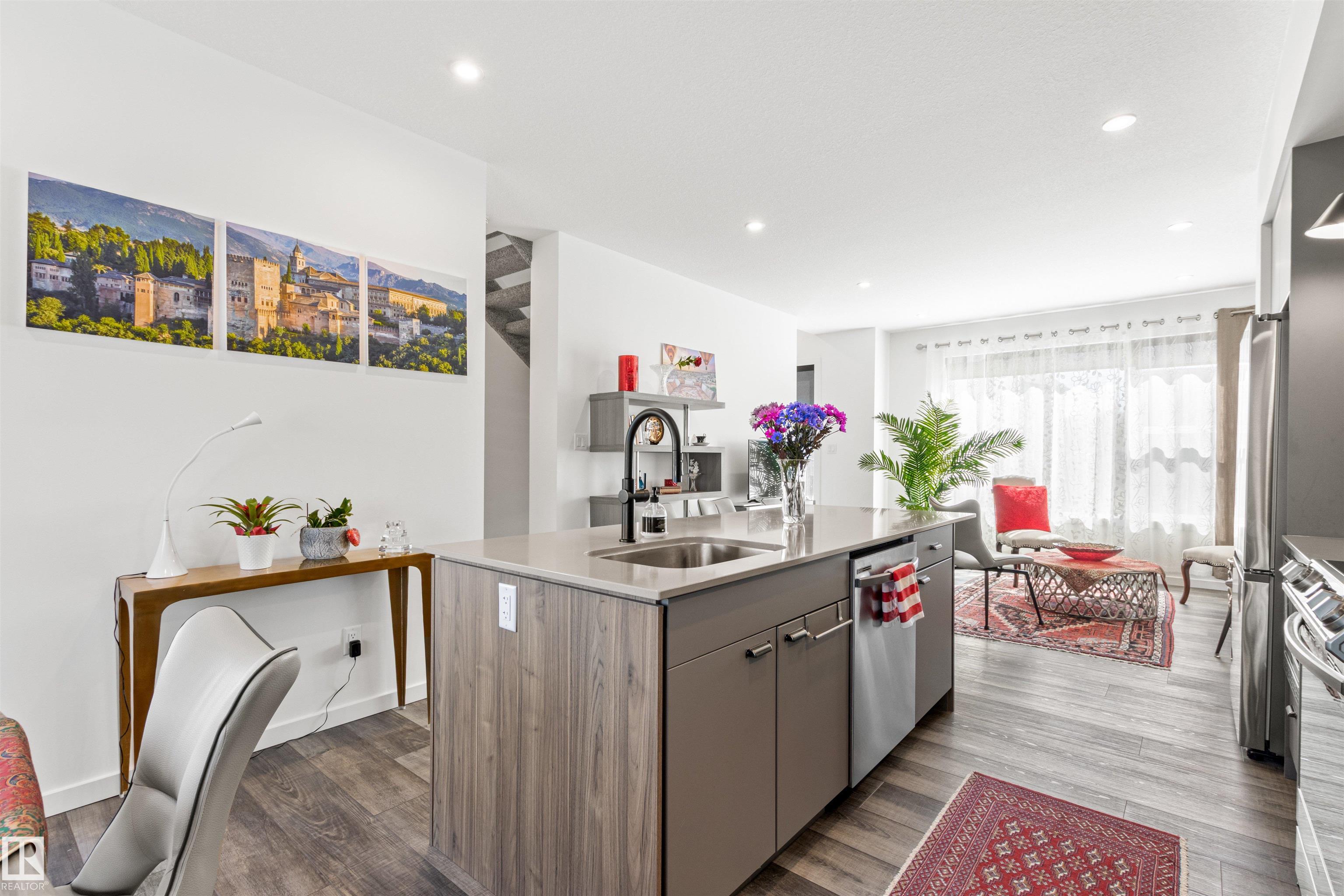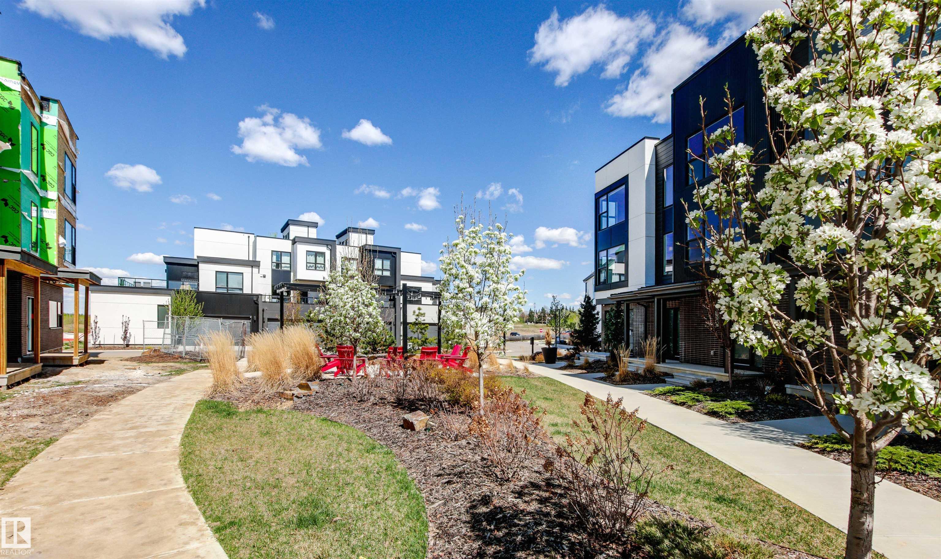 This contemporary 2 bedroom/2.5 bath townhome offers 1,482 square feet of luxurious living space, numerous upgrades and even a ROOFTOP TERRACE! The sunny, spacious main floor with 9-foot ceilings, upgraded kitchen (appliances, extra cabinetry, coffee/beverage bar), elegant dining area with balcony, bright open great room & 2 pc powder room provide a wonderful entertaining space. The upper floor with dual primary bedrooms, each with a spa like ensuite & large closet is perfect for retreating to after a long day. The convenient laundry area is also on this level. A private rooftop terrace which provides an incredible space for relaxing or entertaining, offers expansive views of the surrounding community, Big Lake & STUNNING SUNSETS. Enjoy other upgrades such as central A/C & custom window coverings, throughout. The color palette of soft white & pewter tones paired with organic wood grain accents, create a TIMELESS look. Close to many St. Albert amenities & quick, easy access to Edmonton.