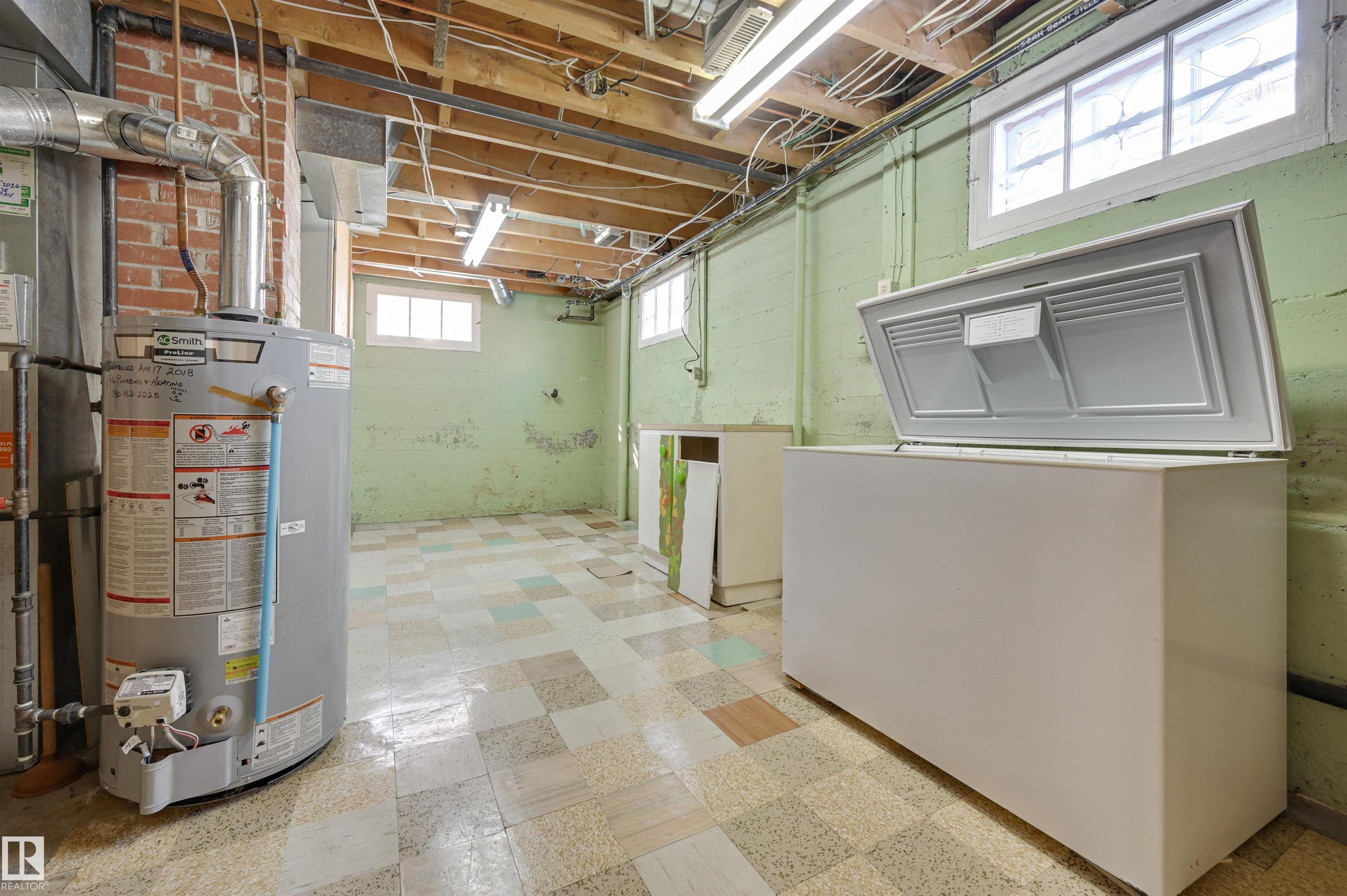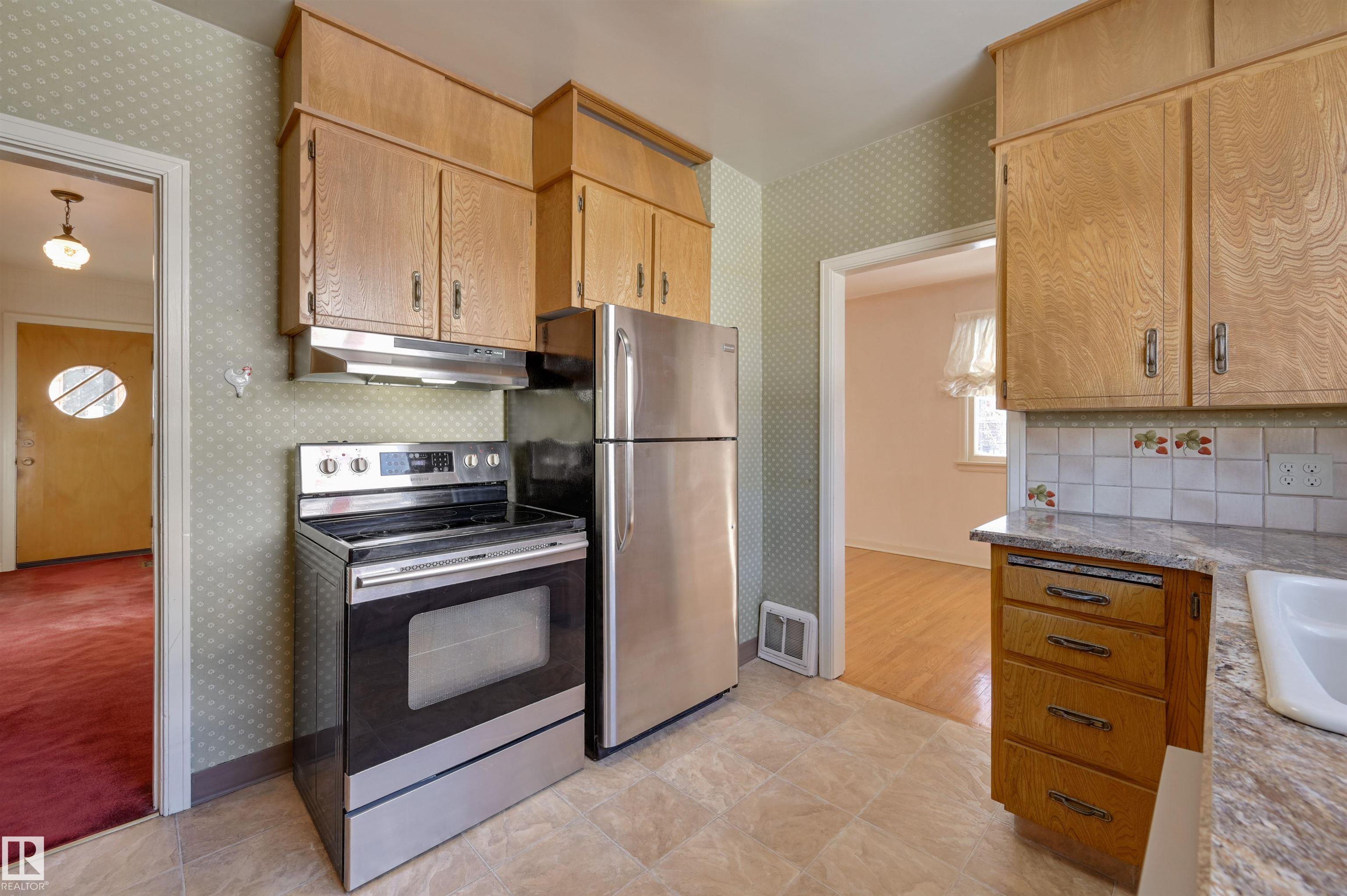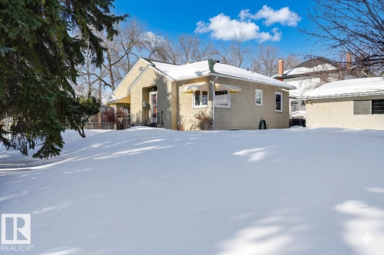 Located in the sought-after Highlands community and facing a beautiful green space, this charming 933 SF bungalow is full of character and timeless appeal. Rich hardwood floors, classic archways, and large corner windows fill the home with warmth and natural light. The spacious living room features a cozy fireplace and flows into the dining area. The bright kitchen offers newer stainless steel appliances, tile backsplash, ample cabinetry, and access to your private backyard. The primary bedroom provides a quiet retreat with generous closet space, plus a second bedroom and 4-pc bath complete the main level. The basement offers a large family room, laundry, storage, and a convenient powder room. Set on a spacious corner lot with a double detached garage. Just one block from Ada Blvd and steps to Edmonton’s stunning River Valley, with easy access to golf, schools, shopping, transit and more. Building has a Restrictive Covenant, limited to Single Family & one Secondary Suite. Some photos virtually staged.