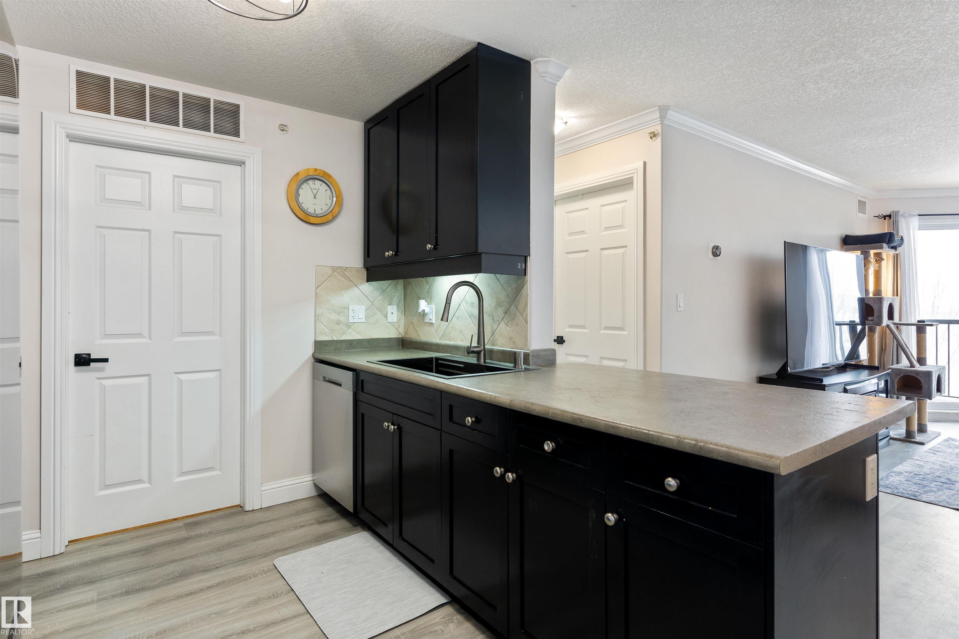 Rare TOP-FLOOR south-facing unit filled with natural sunshine and elegant designer-inspired RENOVATIONS offers an elevated standard of condo living. Flooded with natural light and enhanced by 9’ ceilings, the interior features new vinyl flooring, curated paint selections, updated black lighting, stainless steel appliances, sleek countertops, and a deep single-bowl stainless sink, creating a refined and cohesive feel. The OPEN-CONCEPT kitchen, dining, and living area flo…ws seamlessly to a private south-facing balcony with natural gas BBQ hookup, perfect for relaxing or entertaining. The primary suite offers a WALK-IN closet and private 4-pc ensuite, while the second bedroom sits beside the main bath with walk-in shower, creating a well-proportioned layout for owners or guests. In-suite laundry and titled heated UNDERGROUND parking with STORAGE cage add everyday convenience. A rare combination of top-floor privacy, sunlight, and thoughtful upgrades, designed for comfortable, low-maintenance living.