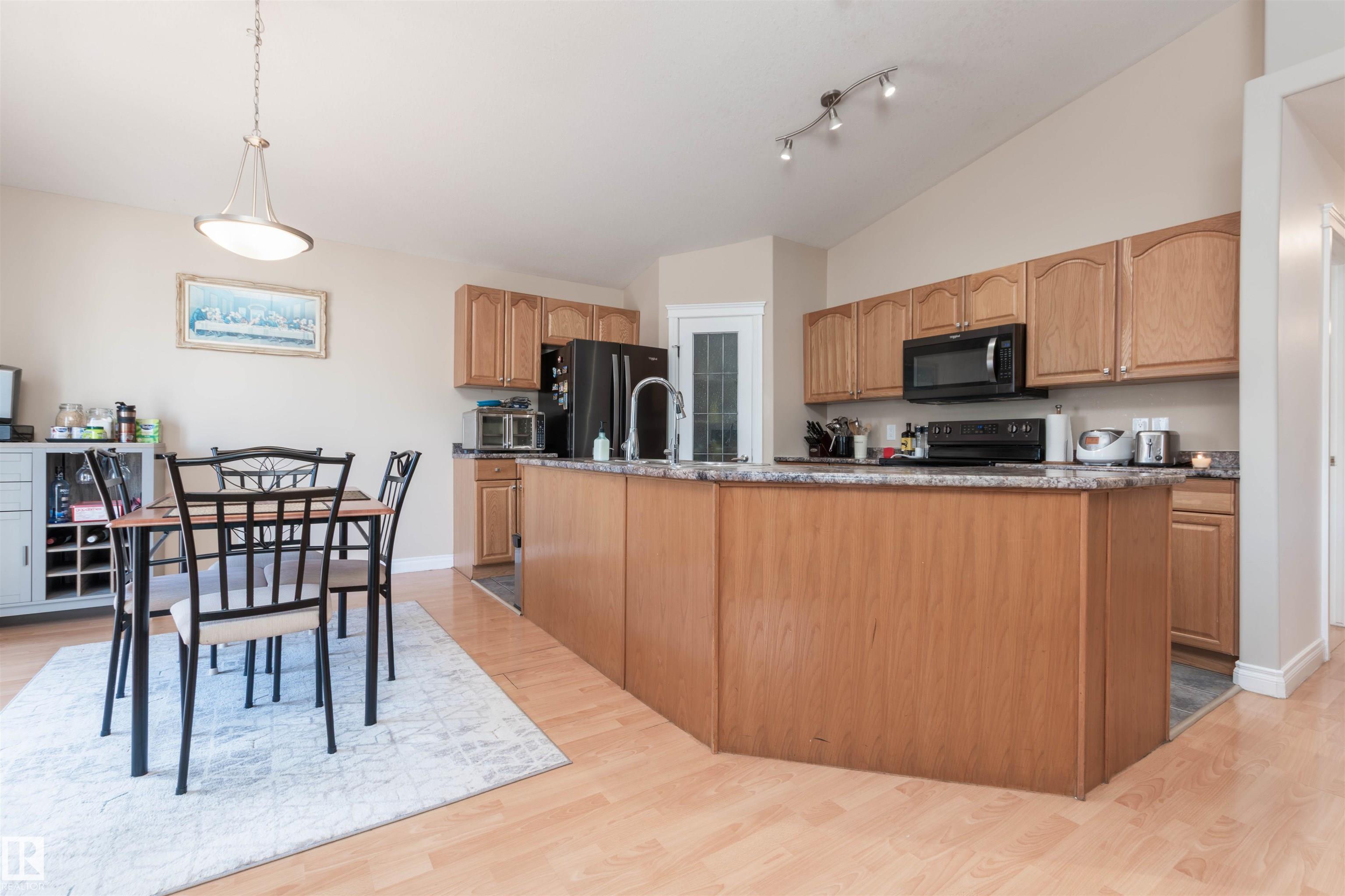 Beautiful 1,270 sq ft, wheelchair accessible bungalow located on a corner lot in desirable Hollick-Kenyon. This open and bright home features a spacious front entrance, vaulted ceilings, updated lighting, and laminate flooring throughout the main floor. The large living room offers a cozy gas fireplace, while the kitchen includes black appliances, ceramic tile, and a convenient corner pantry. The dining area features patio doors to a large deck overlooking a fully fenced back…yard. There are 2 bedrooms and 4 pce bath on the main floor. The primary bedroom includes a walk in closet and private 4-pce ensuite, The fully finished basement offers high ceilings, large windows, a spacious recreation room, two additional bedrooms, and a large 3-pce bathroom with a double shower, seat, and rain shower. This home also features an attached oversized double garage. Ideally located close to schools, shopping, and Anthony Henday.
