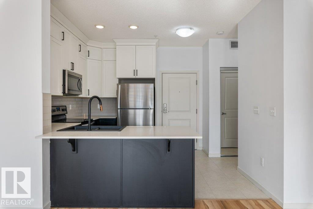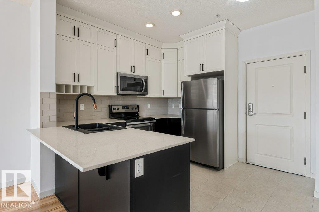 Welcome to this immaculate top-floor condo offering modern comfort and style! Featuring new carpet and fresh paint throughout, this open-concept layout is bright and inviting. The beautiful kitchen showcases stainless steel appliances and flows seamlessly into the living and dining areas—perfect for entertaining. This well-designed unit includes one spacious bedroom with a stylish barn door, a versatile den ideal for a home office, and 9’ ceilings that enhance the airy feel. Enjoy the convenience of in-suite laundry and garbage chutes on every floor. The titled tandem underground parking stall includes a storage cage located just steps from the elevator. Immediate possession available! Ideally situated close to all major amenities, schools, shopping, and more, this move-in ready home is perfect for first-time buyers, investors, or those looking to downsize in comfort and style.