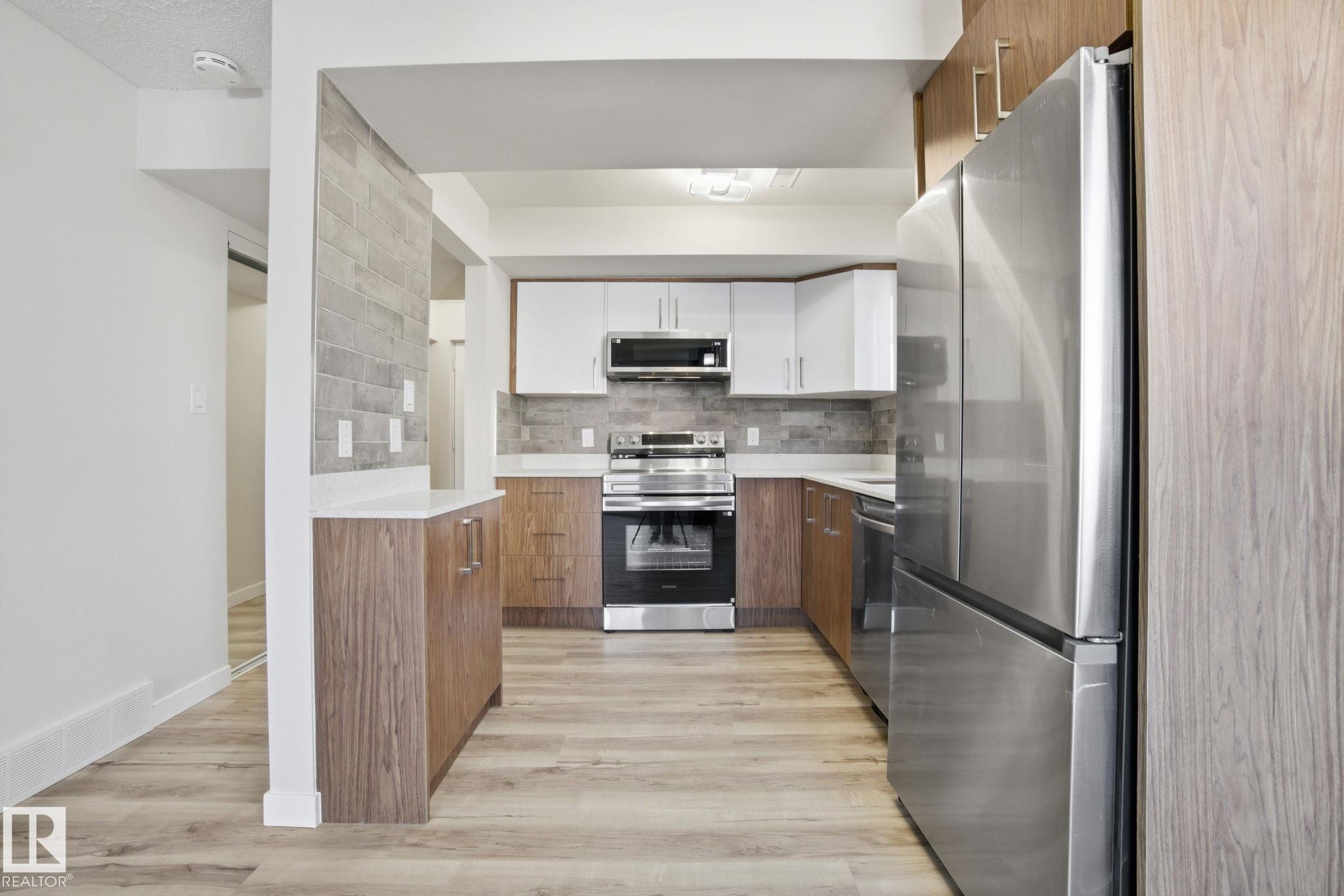 Beautifully Renovated Townhome in Lancaster Terrace. This stunning two storey townhome has been fully renovated from top to bottom, offering chic modern living at an affordable price. The main floor features a two piece powder room, stylish modern kitchen with white cabinetry, quartz countertops, and stainless steel appliances, opening to a spacious dining and living area accented by a striking feature wall with an electric fireplace. Step out onto your private balcony, perf…ect for morning coffee or evening relaxation. Upstairs, you will find a convenient laundry area, three bedrooms, including a beautiful primary suite with a gorgeous ensuite with tiled shower. The main bathroom is equally impressive with quartz counters and tile flooring. Enjoy new flooring throughout with vinyl plank on the main and soft carpeting upstairs. Includes one covered parking stall. This well managed complex offers exceptional value and a stylish, move in ready home in a fantastic location. Photos are virtually staged.