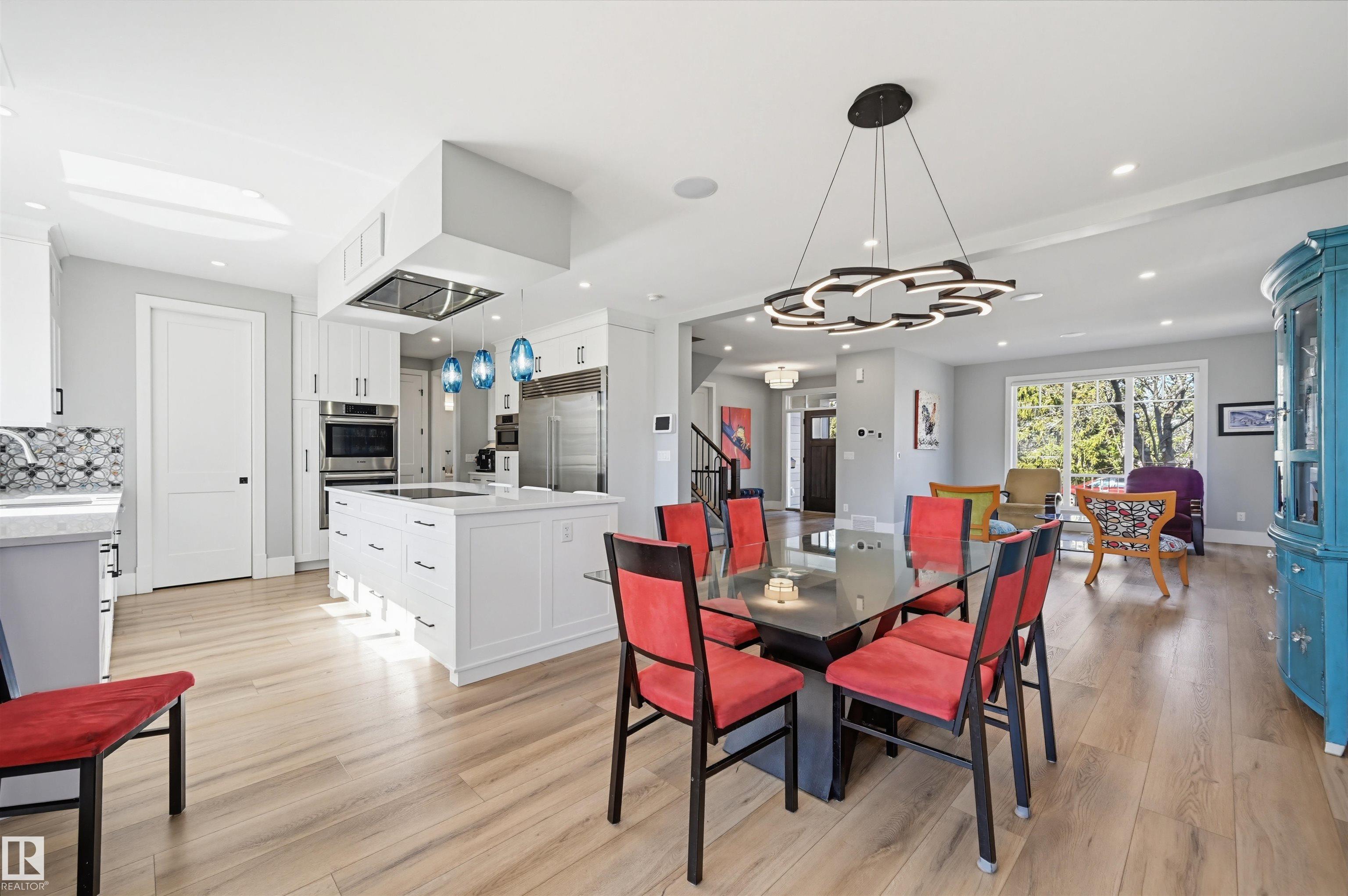 Built in 2022 and designed for busy family life and effortless entertaining, this stunning home offers over 3,800 sq.ft. of finished living space with 5 bedrooms, 3.5 baths, and a heated triple garage. Set on a quiet, tree-lined street, the open-concept main floor is made for gathering with a chef’s kitchen featuring a large island, quartz throughout, walk-in pantry, premium appliances, and seamless flow to the dining and living areas. The living room is filled with natural light and anchored by a gas fireplace with tile surround. Step out to the covered deck with built-in BBQ, fireplace, and speakers—perfect for hosting year-round. A main floor office or guest room, spacious mudroom, and front veranda add everyday function. Upstairs offers 3 generous bedrooms, laundry, and a luxe primary retreat with vaulted ceilings, private balcony, and spa-like ensuite. The finished basement adds a large bedroom, full bath, wet bar, and rec room for movie nights, teens, or guests.